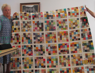 Shauna made two quilts for sisters getting married this summer. This first one is basically an Single Irish chain, with a "snowball" between each 9 patch. The squares are all 2 1/2" from her scrap box.